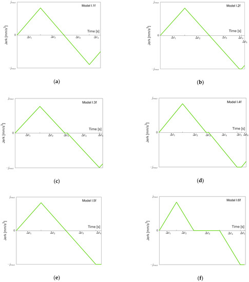 We first assume , and we neglect the restriction on maximal velocity. In order to manage complexity, we split the task of finding suitable models into two parts: going “forth” from to and going “back” from to . Figure 5 shows possible jerk models for going “forth” using maximal, minimal or zero snap (the notation “I.xf” refers to these models in Case I). The first four models are built using the criteria of whether is or is not reached when going from the maximal acceleration (of this function) down to acceleration zero, and is or is not reached. Model I.1f depicts the situation where and are both not reached. Model I.2f shows the motion going “forth” when is reached but is not reached, whereas Model I.3f is vice versa. In Model I.4f, both and are reached. In both models I.2f and I.4f where is reached, still holds, which need not be the case. As in Model I.2f, in Model I.5f is reached and is still not reached, but now, . Finally, in Model I.6f, both and are reached (as in Model I.4f), and . Note that Models I.5f and I.6f could also be treated as special cases of Models I.2f resp. I.4f with resp. . We decided to set up separate models for two reasons: reaching certain limits (here ) is more recognizable by having a model change, and the models can then be simpler (see the formulae in Table A1).