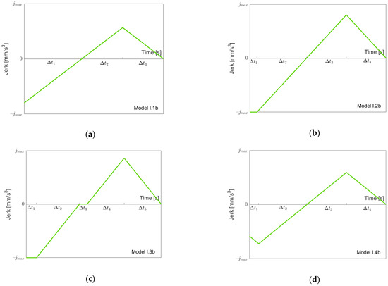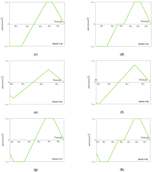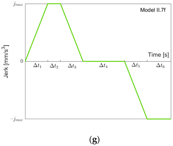Figure 6 depicts the possible models for going “back” from to . Clearly, before (or at the same moment as) the acceleration goes down to , the jerk reaches its minimal value . Therefore, we have a simple sequence of the three models I.1b, I.2b and I.3b, as shown in Figure 6a–c when we proceed from to . Note that not all models must be present depending on the value of . When we then proceed from to , as described in the previous section, one of the Models I.4b to I.7b might occur (Figure 6d–g). Models I.4b, I.5b and I.7b simply add a “front piece” starting at , which goes up to zero. Model I.6b is needed, since when starting with Model I.7b and reducing , it is possible that first, the minimal jerk becomes larger than before the minimal acceleration becomes larger than . Note that when reaching , the model must be symmetric, since one starts and ends with acceleration zero. Again, one could treat Models I.1b, I.2b and I.3b as special cases of Models I.4b, I.5b and I.7b with , but, for the same reasons as stated above, for going forth, we treat them separately. From the jerk models, one can easily produce acceleration and velocity models using the initial values 0 and , respectively. We have three conditions that must be fulfilled ( denotes the sum of the time intervals):