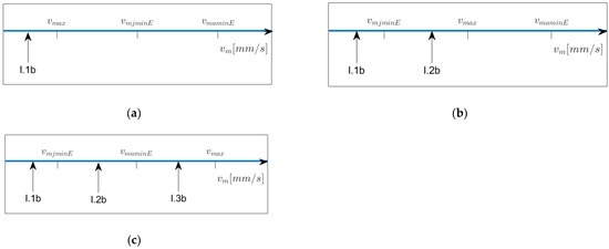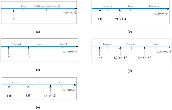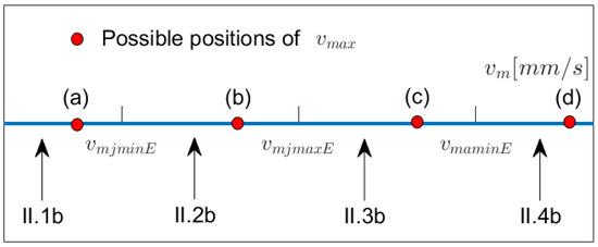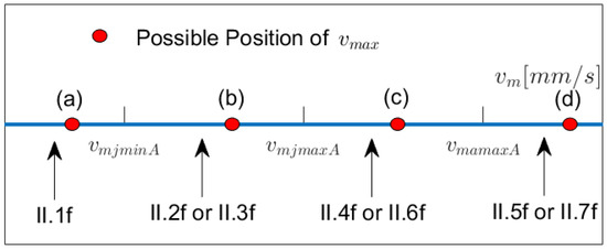 Note that “critical” velocities might be larger than . We will look at the possible configurations below. Next, we investigate at which value of in the going “back” part the minimal jerk and the minimal acceleration are reached (denoted by and by , resp.). In the “going back” situation, we always have , and we obtain using Equation (6) with and by setting in Model I.2b (see Table A5).) Figure 7 depicts the possible relative positionings of , and on the -scale and provides information on which model to apply when lies within a certain interval left of . In Figure 7b,d,e, Models I5.f resp. I.6f have to be chosen once is reached. Note that the interval of possible values for starts at and ends at , so if, for example, in Figure 7c or e, then Model I.1f does not occur.