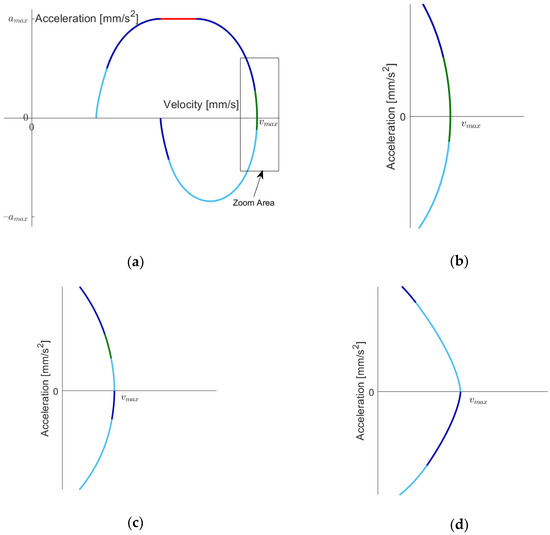 So, we are able to specify the applicable model when runs from from to in Case I. The remaining task consists of finding the correct model when we go from to , i.e., we keep constant and let run from to 0. The additional challenge here originates from the possibility that already-reached extremal values , (for going forth) resp. , (for going back) might be no longer reached. For example, when was reached (going forth) and moves to zero again then, at some value of , the minimal jerk has to be above since we are in Case I. Figure 9 demonstrates this in the velocity acceleration plane where we omit the boundary curve for better visibility of interesting curve sections: we have for the restrictions, , and , resulting in a distance (in our examples, the units are always , , , and , respectively, and we omit these in the sequel for brevity). We recognize Model I.6f for going forth and I.2b for going back in Figure 9a,b. When we now enlarge to , we obtain a distance of 167, and we see in Figure 9c that the models switched to I.4f and I.4b, respectively. When we now consider the final jerk value zero, we obtain as distance 201.19, and Figure 9d shows that the going forth model again switched to I.3f, whereas the going back model does not change. The three curves in Figure 9b–d are close to each other, but by zooming, we see that we obtain higher curvature when moving to . In this case, the maximal acceleration is still reached, but when one moves closer to such that the part with constant acceleration is very short, another model switch might occur. This illustrates the inherent complexity, which cannot simply be sidestepped.