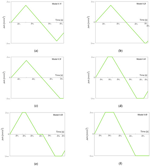 In Case II, we proceed analogously to Case I. Again, we take an intermediate velocity and a corresponding jerk and go “forth” from to and “back” from to . Figure 11 shows possible jerk models for going “forth” (the notation “II.xf” describes these models in Case II) using maximal, minimal or zero snap. In Case II, there are three interesting switching points: is reached when going down from the maximal acceleration; resp. is reached when going up from . Note that Models II.1f, II.2f and II.3f are identical to Models I.1f, I.2f and I.5f. In the other models, the maximum jerk is reached, which is not possible in Case I.