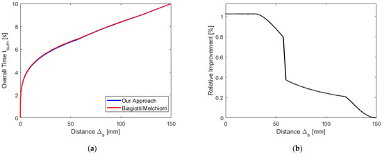 Next, we find out at which values for certain model switches occur. We set and proceed similarly as when determining the critical velocities: in the models, we add an additional equation depending on which extremal acceleration or jerk has been reached, and we determine as an additional unknown; the latter can be computed directly or via solving a polynomial equation. If the solution leads to non-admissible values for or to negative values for time intervals, then there is no feasible solution. Since the computations are straightforward and can be easily performed using a CAS, we just give the results that are needed for implementation. The procedure is described in more detail in Algorithm A3. We first consider the going forth part and refer to Figure 7 regarding the possible positionings of . If we have situation (a), Model I.1f will be applied for all jerk values. If situation (b) applies, we proceed as follows: