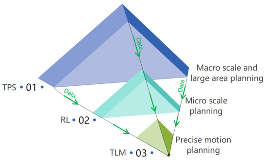 A framework of the RLTT method: a planning hierarchy framework of three levels for motion planning with data flow.