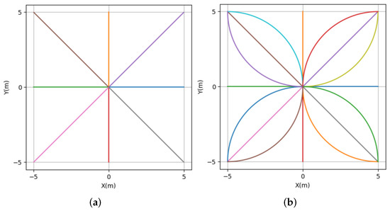 Straight-line trajectory lane and semicircle trajectory lane models. (a) Straight-line trajectory in 8 action directions. (b) Semicircle trajectory in 16 action directions.