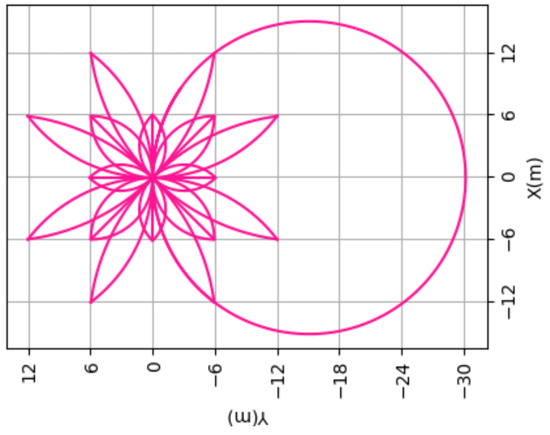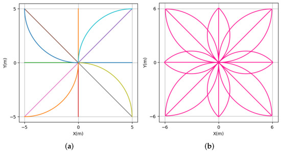 (4) TLM—type five: This type of TLM, with 40 direction actions, has more actions than the third type and can comprise the third type and 8 direction-action smooth semicircles (Figure 5a); this can be seen in Figure 5b. To some extent, this type of TLM has sufficient actions to achieve motion planning and can achieve proximal optimal motion planning. Figure 6 shows the 40 direction-action TLM with one example of a smooth circle. A theoretical analysis is provided in Lemma 1, which can prove that type four is the proximal optimal trajectory; in Theorem 1, completeness of trajectory space is proved.