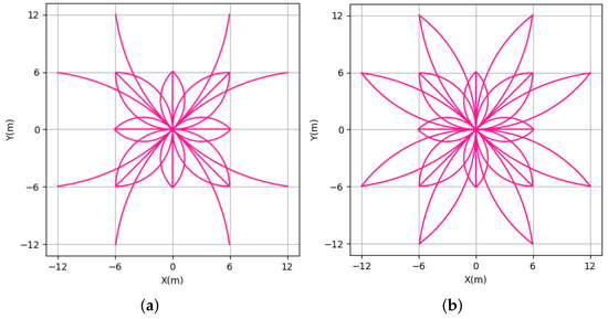 (3) TLM—type four: This type of TLM, with 24 direction actions, has more actions than the second type and can comprise the second type and 8 direction-action trajectories near the maximum rudder angle along the x and y axes; this can be seen in Figure 4b. This type of TLM is similar to the third type, and sometimes the type of TLM for motion planning is also locally optimal.