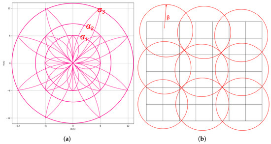 (a) Different circles of proximal optimal TLM that cover different points. (b) Covering areas that satisfy the vehicle’s dynamic constraints using the proximal optimal TLM.