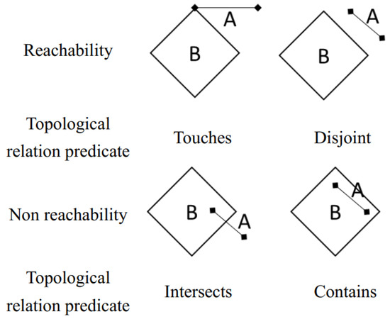 For a large-scale and efficient path search, a topological map meant for high path search efficiency is constructed [46,47]. During the path searching process, the open geospatial consortium (OGC) is used to make a topological map [48]. OGC defines a simple feature model that is suitable for efficiently storing and accessing geographic features in relational databases.