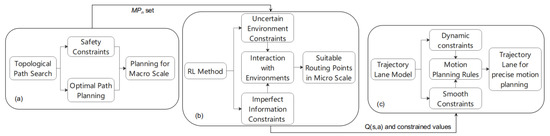 Indeed, agents using RL methods can learn how to automatically navigate a vehicle via exploration and exploitation [13,14]. Therefore, combining RL with traditional methods is significant as it can achieve better performance in uncertain environments for vehicle motion planning. However, how to combine traditional methods with RL and consider safe, effective, and precise motion planning while leveraging the advantages of these two methods and overcoming their shortcomings is a challenge. In this study, a strategy is proposed in which RL is constrained, thus leveraging traditional methods such as the topological path search (TPS) and the trajectory lane model (TLM) to achieve safe, effective, and precise motion planning (named RLTT).