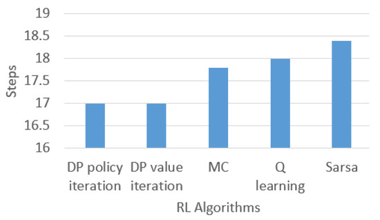 More specifically, the averaged computation times for the RLTT method and Q learning for motion planning were 0.325 (s) and 52.279 (s), respectively. In addition, the trajectory distance when using Q learning is usually greater than that when the RLTT method is used. We randomly selected one of the five experiments and computed the trajectory distance. The distance when using the RLTT method was 95.834 (m), whereas that when using the Q learning algorithm was 126.735 (m). The results indicate that the performance of the RLTT method was better than the classic RL algorithm, and the RLTT method achieved a shorter trajectory distance and used less time for the path search as compared to the classic RL algorithm.