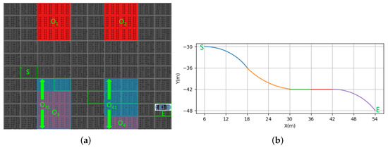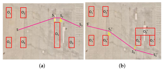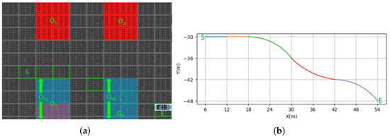 The micro-scale motion planning (generally, the planning area can be set at approximately 100 m) was achieved, as shown in Figure 13 and Figure 14, where the environment information is unknown. The start point is the S point and the end point is the E point. The obstacle is denoted by O. RL was constrained by TPS and TLM, and it was used to dynamically explore the suitable point from the S to the E points. TLM was used to splice the RL points, where the smooth and dynamic constraints were considered; the two bottom obstacles randomly changed within a certain range. In particular, obstacles and randomly changed within the and ranges (as shown in the light blue rectangles); therefore, the motion planning is different in Figure 13 and Figure 14.