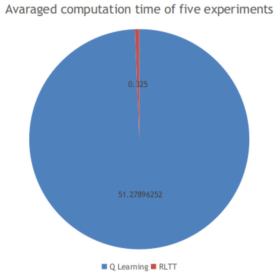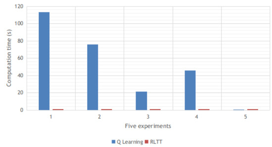 We conducted five experiments using the RLTT method and the Q learning algorithm in unknown environments. The Q learning algorithm is a classic and commonly used algorithm for vehicle navigation. The computation time of each experiment and the averaged computation time of the five experiments using the RLTT method and the Q learning algorithm are shown in Figure 16 and Figure 17, respectively.