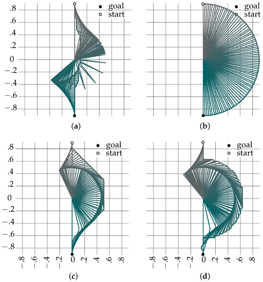 The motion of a two-DoF planar mechanism. (a) Cost and heuristic functions: distance in -space. (b) Cost and heuristic functions: distance in -space. (c,d) Cost and heuristic functions: combination of the distance in -space and the linear manipulability of the mechanism.