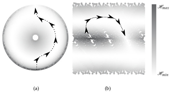 Now, let us consider a combinatorial pair of costs and heuristics: distance travelled in -space and the manipulability of the mechanism. Here, special attention should be devoted to this combination. The main task of the heuristic function is guiding the search towards the goal posture of the end-effector, where the function’s value is zero. This seems to be trivial in the context of heuristic functions that are a function of the distances travelled in -space and -space: the functions sink towards the goals, and the distance yet to be travelled to reach the goal at the goal posture of the end-effector is zero. The distributions of the manipulability in -space are, however, geometrically in hyperbolic shapes of different dimensions. Hence, a simple distance function leads the search either to the portions of the -space with higher manipulabilities or even to singularities. Nonetheless, a combination is very beneficial. For instance, we can exploit the distance function in -space to provide information on the direction of the exploration towards the goal and ensure the admissibility of the heuristic function and a reformed manipulability function to guide the search towards the portions of the -space with higher manipulabilities. Examples of such are