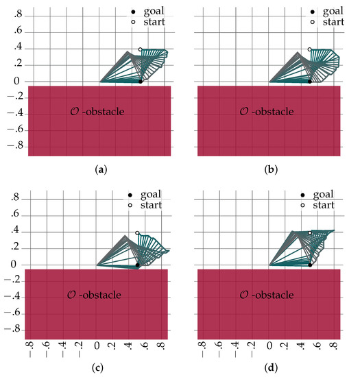 The motions of two-DoF planar mechanism in presence of a -space obstacle; (a) Cost and heuristic functions: distance in -space. (b) Cost and heuristic functions: distance in -space. (c,d) Cost and heuristic functions: combination of the distance in -space and the linear manipulability of the mechanism.