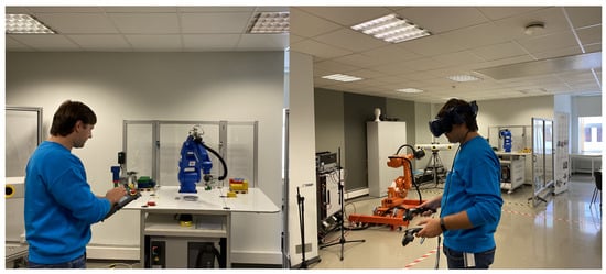 There is a growing body of literature recognizing the importance of digital twin (DT) in numerous research fields. An increase in the number of publications involving industrial human–robot interaction (HRI) and human–robot collaboration (HRC), in particular, demonstrates the focus of DT research in which virtual implementations of physical robot cells enable safe and efficient tools for system evaluation, training, and offline programming []. Despite the growing prevalence of DT in such applications, however, there is relatively little known about the human factors that drive and impact DTs of manufacturing systems []. Significant efforts continue to move toward human-centric design and implementation. Villani et al. [], for example, present an extensive overview on HRC in industrial settings focusing on the main topics of safety, applications, and intuitive human–machine interfaces (HMI). That study presents alternative solutions to the traditional interfaces (i.e., based on keyboards and mouse, or teach pendants), namely walk-through programming, teach-by-demonstration methods, multimodal natural user interfaces (NUI; e.g., vision-based gesture recognition and audible speech recognition), and augmented, virtual or tangible user interfaces (TUI). That survey further points out the advantages of these innovative approaches in terms of reduction of time and costs related to the robot programming task and safety assessment, while also highlighting the importance of evaluating human factors such as stress, workload, and mental safety.