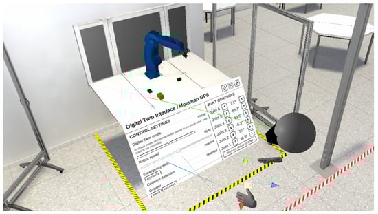 The DT system used as a basis for this experiment was developed at the TalTech Industrial Virtual and Augmented Reality Laboratory (IVAR) during the previous research on the relevant topic (see [,,]). The system was developed using the Unity game engine, and contains a digital model of an industrial robot that can be manipulated using the accompanying UI located in virtual environment (see Figure 2).