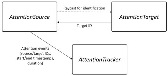 An attention tracking system was developed to record the behavior of the human subjects during the experiment. This system allows “tagged” objects in the virtual environment as attention targets, and produces reports on how long the user’s attention was directed to the specific object and at what specific moments in time. The system’s principal architecture diagram is shown in Figure 3.