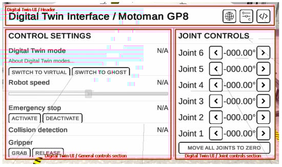 The DT interface is segmented into three primary zones (see Figure 4), two of which are used for controlling the robot’s actions. The interface’s header draws the operator’s attention to the robot being controlled using the DT interface. The general controls section is used to adjust system settings, including robot speeds, activating/deactivating the robot, and actuating the gripper. The joint controls section is used to adjust the orientations of the individual robot joints, starting at the tool flange (Joint 6) and moving down the kinematic chain to the base (Joint 1).