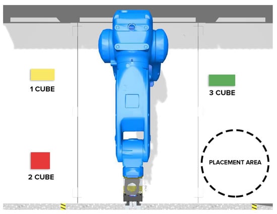 The experiments presented in this study consist of both physical and virtual tests in identical work cells as showed in Figure 1. Both the physical and virtual robot configurations were used to complete identical material handling tasks. The tasks consisted of moving three cubes–located in different parts of the workspace to a predefined target region. Each cube has a predefined starting position and must be picked up and moved to the target region in a specified order. The robot is teleoperated by the human subject using interfaces specific to the operating environment: experiments using the real robot were performed using the teach pendant provided by the robot’s manufacturers (see Figure 1), and experiments using the virtual robot leveraged a custom user interface displayed in the simulated environment (see [], and Section 2.3.1 for the description of this interface.