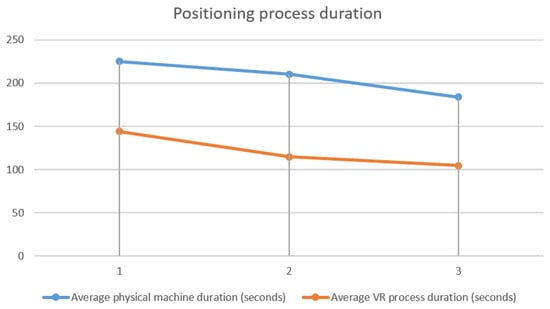 Regardless, it is evident that, as the volunteers use the interface more, the times to complete the task are, generally speaking, monotonically decreasing. Similar trend lines are also seen while using the physical interface, as shown in Figure 6, it is also decreasing with the same average tempo. As is seen on the figure, on average the virtual trials took less time to complete than the physical trials. This may be attributed to some experience gained during the physical trials being applied to the virtual interface and person mental readiness for the future step. Moreover, virtual environment might seems more simple for the users due to it is similarity to the computer game rather to standing next to the physical machinery.