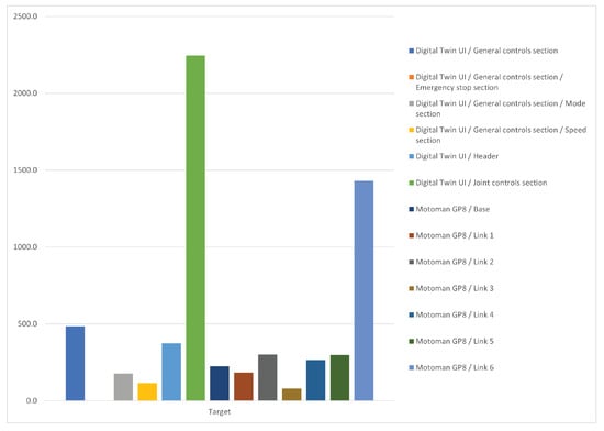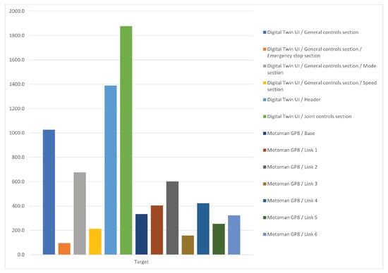 By comparing eye-tracking data collected during VR robot programming tests (Figure 7 and Table 8 for Group A, and in Figure 8 and Table 9 for Group B), it is clear that time spent looking at the UI controls is considerably higher (more than double) than time spent in looking at the virtual robot. For Group A, the regions containing the general controls, joint controls, and header are among the virtual UI targets with highest focus times. For Group B, the attention tracking system gave slightly different results. Figure 8 shows how the joint control section is still the area that was visualized for the longest time. In this case, though, timing relative to the general control section and header are much lower. In contrast, time spent looking at the physical industrial robot joint 6 is much higher than in the previous experiment.