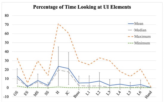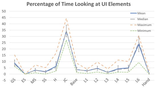 Average operator use of the interface, plotting the mean, median, maximum, and minimum amounts of time spent focusing on different parts of the UI for Group B. The error bars represent a single standard deviation from the mean. The labels on the horizontal axis are those introduced in Table 8.