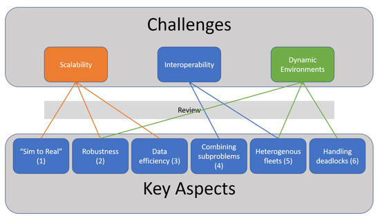 A variety of RL algorithms for controlling autonomous fleets of vehicles has been presented in the previous sections. In addition to the types of control, the possible sub-problems for such algorithms have been presented in particular. There exists already a number of different promising algorithms for controlling fleets of AMR using RL, especially in environments of higher complexity. While some of the algorithms are already capable of coordinating fleets of up to 2000 vehicles [40,41], others are particularly efficient or capable of taking on tasks that could previously not be solved in this way. The basis is the potential of RL algorithms to handle high complexity problems, as well as the flexibility in solving problems, due to the reward concept. However, there are also challenges that have to be taken in order to develop a control system suitable for a wider application in industry. Six key aspects should be investigated further in order to achieve such a transfer. (1) overcoming the “sim-to-real gap” [23], (2) robust algorithms [72], (3) data efficiency [25], (4) combining different fields of application [69,70,71], (5) enabling heterogeneous fleets [73] and (6) handling deadlocks [42]. These six key aspects can be divided into the challenges scalability, interoperability and dynamic environments (see Figure 2). We will deal with these categories separately in the discussion.