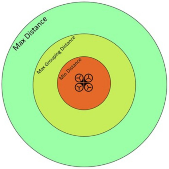 Figure 20. A confirmation implementation was designed to replicate a real world application. Given that the most robust models were constructed using images from two levels, two sUASs were used in the team. The two sUASs took off and move into the grouping phase. Once the entropy of the system fell below the threshold value of 0.1, the team moved into the mission phase and started its movement to the object of interest. When the team got closer to the object, they shifted into an orbit pattern, with one sUAS moving into a higher position and the other moving into a lower position, and started their orbit pattern. As the orbit began, so does the recording. A typical orbit took approximately 2 min and 10 s, and approximately 500 images were recorded.