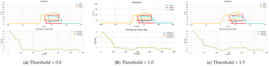 Figure 6, the effect of the entropy threshold value can be seen during the experiment with three sUAS. As the selected entropy threshold increases, the smoothness of the sUAS trajectories increases. Increasing the entropy threshold is another means by which to configure system grouping and mission priorities. The results with a threshold of 1.0 were determined as the best due to an adequate mix of smooth trajectory and early formation cohesion. The top plots of