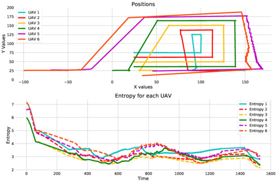 position of each sUAS, and the lower plots depict the entropy values over time.