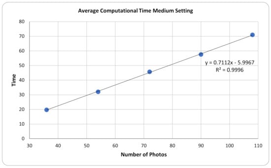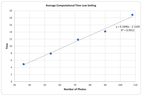 Figure 13, it can be seen that using the “Medium” setting requires approximately the same time to compile 36 photos as the “Low” setting takes for 108. This can be effective if the limiting factor is the number of photos available. There is also a subjective solution to what makes a model the “best”. In ideal circumstances, time is not an issue, and camera placement can be effectively controlled. However, in a real world implementation, the decision on what makes a model good enough could be entirely dependent on the time available. It is also of note that using too much data has a negative effect of adding too much noise to the model (