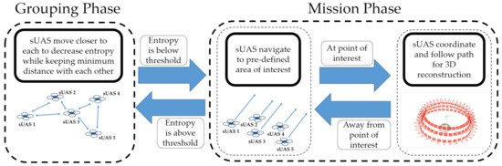 1], while reducing the computation time required to accomplish this task. Several experiments were conducted in different situations to evaluate the optimum positioning and settings dependent on the scenario. Experiments were performed to evaluate the optimum entropy threshold values that allow the team of sUASs to navigate effectively without interfering with each other or failing to navigate along the desired course, and then perform a coordinated 3D reconstruction mission in a distributed fashion. The intention of this paper is to both present the framework design with extensive analysis, and to show proof-of-concept results of the entire pipeline in an Unreal Engine simulator (AirSim) that is very accurate at representing real-world applications. The demonstration of real-world results using the developed framework is not included in the scope of originally intended contribution in this article, and is left for a future work.