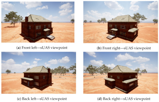 AirSim provides the capability to take images from the perspective of the sUAS in the simulation environment. These are the images that were used in the reconstruction of the 3D model. The resolution of these images can be specified in the settings, and for the validation model experiments, they were set to 3840 × 2160 pixels. Images from the perspective of the sUAS are depicted in