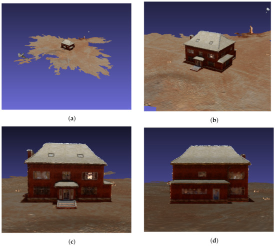 Figure 22a depicts that the area around the house was limited to a reasonable area without the interference of multiple outliers. By limiting the area to a small radius, it is possible to generate better models and reduce the amount of time required to complete it. The reconstructed model has enough details; the ones that can be noticed are entry and exit locations, the chimney, and windows. Upon close inspection, the gutters can also be observed. It is clear enough that if a person, car, or animals were in the example, they could also be recorded. This provides confidence that the developed framework can perform well in real world applications. As presented in 3D reconstruction parameter analysis section, in the virtual world, it is more difficult to detect features because everything is perfectly simulated. In the real world, on the other hand, there are more features to detect, as presented in