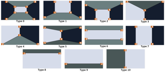 RoomNet [47] reformulated the task of room layout estimation as an ordered room layout keypoint localisation problem, which can be directly addressed using CNNs as a trainable end-to-end problem. RoomNet considered a list of different layout possibilities with their respective keypoint definitions that could be inferred from a single image; these possibilities are first introduced by [48] and are listed in Figure 1. These 11 layouts cover most possible situations under typical camera poses and common cuboid representations under the “Manhattan world assumption” [49]. Once the trained model estimates correct keypoint locations with an associated room type, we can simply connect these points in a specific order to produce a boxy room layout representation.