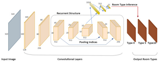 RoomNet adopts the SegNet architecture proposed in [50] with modifications. The base architecture of RoomNet adopts the same convolutional encoder–decoder network as SegNet. Using an image of an indoor scene, the system can directly identify a set of 2D room layout keypoints to recover the room layout. Each keypoint is represented by a 2D Gaussian heatmap centred at the true keypoint location. The encoder–decoder architecture processes the information flow through bottleneck layers, enforcing it to implicitly model the relationship among the keypoints that encode the 2D structure of the room layout.