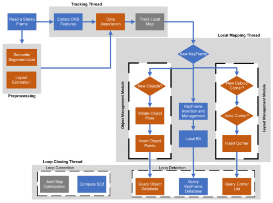 Figure 3 shows an overview of the proposed system. Like ORB-SLAM2, the developed system consists of three threads: tracking, local mapping, and loop closing. Each thread was redesigned to exploit the semantic and geometric information to accurately estimate the trajectory and environment map. The system embedded an offline learnt object model database for the common objects in the AI2Thor [74] scenes. This section presents a detailed description of the system’s threads, highlighting the modified (grey) and the new (orange) components introduced to the ORB-SLAM2.