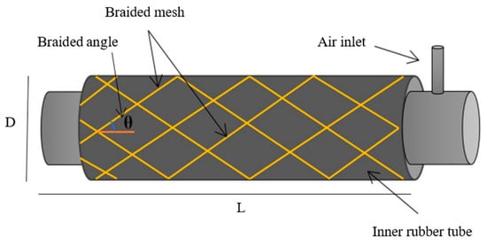 Several experiments have been done to investigate the behaviour of the air actuator in terms of contraction and tensile force. The maximum contraction ratio for this system depends on several parameters, including the inner tube characteristics (see Table 1), the braided mesh dimensions, and its expandable ratio (Table 2). The diameter of the mesh expands by 46% and that limits the contraction ratio. Another factor that limits the contraction ratio is the braided angle θ (Figure 1) which also controls the behaviour of the actuator. The braided angle gives the contraction behaviour of the PAM if its value is less than 54.7° [,].