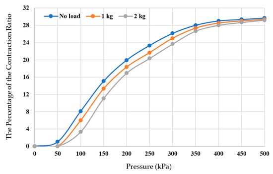 The percentage of the contraction ratio in Figure 3 illustrates that the system stops contracting at 29.67% and the percentage is 29% at 400 kPa at different loads, and the load does not impact the contraction ratio at high pressure. From Figure 2 and Figure 3, the PAM reaches the maximum shortness at 400 kPa and the last 100 kPa does not add significant change. Therefore, the maximum operating air pressure is selected at 400 kPa for safe working and to decrease the probability of actuator damage.