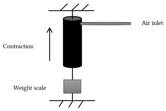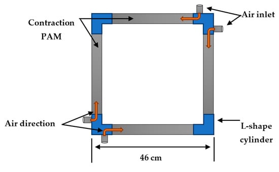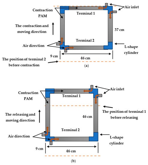 The air inlet allows the airflow in both directions to control the length of the PAM. The simple description for the behaviour of the contraction actuator is the shortness in length at the filling process, and that provides a tensile force depending on the dimensions and the contraction ratio [].