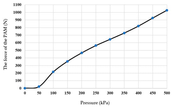 Figure 5 illustrates that the manufactured PAM has a high power-to-weight ratio. The weight of the actuator is 0.38 kg, while the contraction force is about 104 kg, giving a ratio of 273.7. This powerful behaviour gives the robot the ability to move against gravity and friction. Compared to conventional actuators, shape memory alloys, rigid pneumatic cylinders, and electrical actuators, the PAM shows high performance in most of them [,].