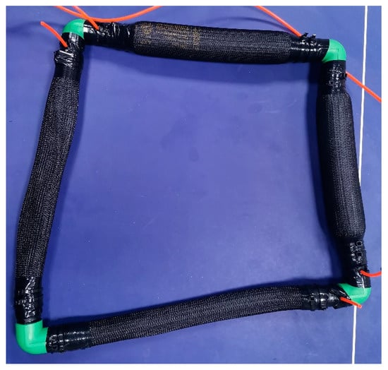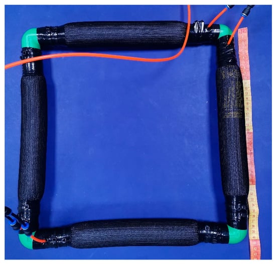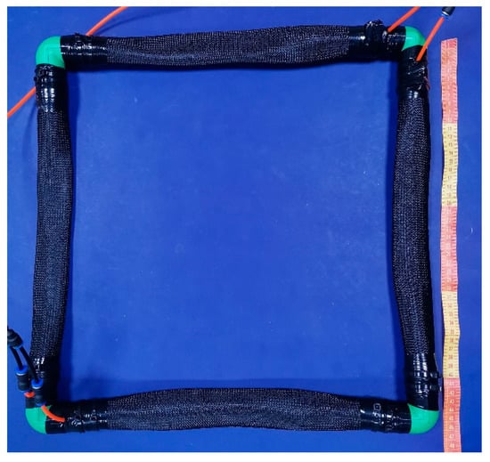 The proposed robot shifts its shape by changing the length of each side individually or by a combination of two, three, or all of them simultaneously. The change in length depends on the amount of air pressure and the structure of the PAM []. Figure 11 Illustrates a photograph of the proposed soft mobile robot at zero pressure, and Figure 12 shows the A4SMR at 200 kPa on each side.