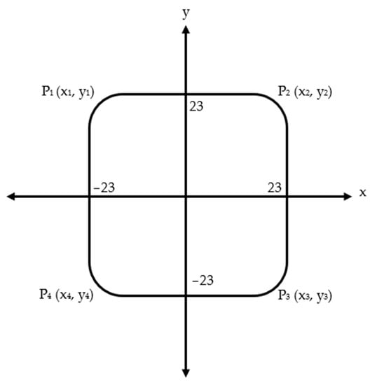 (−23, 23), (23, 23), (23, −23), and (−23, −23) respectively. Therefore, the shoelace formula is: