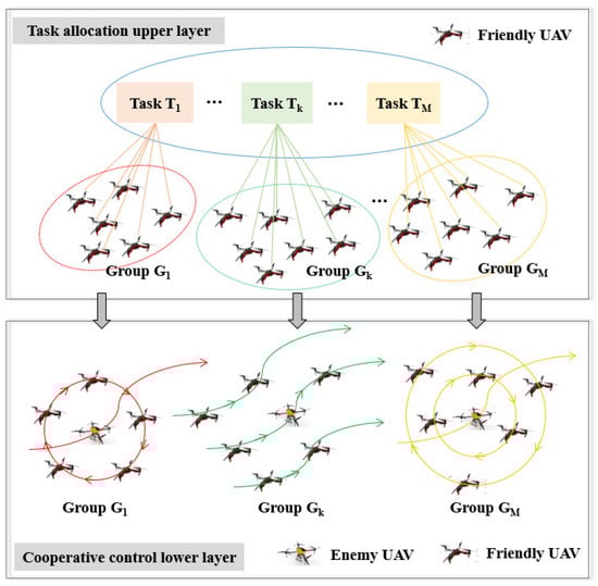 The UAVs allocate the tasks by considering their cooperative behavior first. Then, the UAVs allocated for same tasks form the same groups. Finally, a cooperative formation control law is designed to drive UAVs in the same group to complete the task together. Therefore, the air combat structure can be established by a two-layer framework containing a task allocation upper layer and a cooperative control lower layer, which is shown in Figure 1.