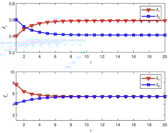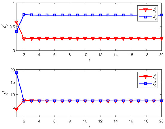 In the task allocation upper layer, the profits and the costs of the two tasks are given by , , , and , respectively. Other parameters are given as , and . The initial properties of allocated tasks 1 and 2 are randomly set as and , respectively. Based on the utility function (6) and replicator dynamic function (4), evolutions of the UAVs’ decision are depicted in Figure 3. It can be seen from Figure 3 that the properties of allocated tasks 1 and 2 converge to and finally. It indicates that there is UAV performing the reconnaissance task 1. In addition, there are UAVs performing the attack task 2. Then, the diagram of UAVs can be depicted in Figure 4 intuitively.