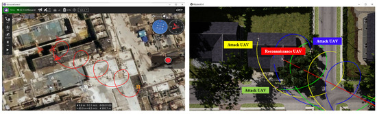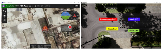 In the cooperative control lower layer, the UAVs adopt the cooperative control law (13) with (14) and (15) to perform a desired formation to accomplish the task. The initial positions of all the UAVs in both QGroundControl and Rflysim 3D are shown in Figure 5. The desired distance and angular spacing are and , , respectively.