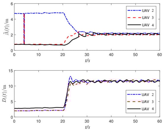 The UAVs perform a tracking formation when , which represents that the UAVs are tracking the enemy UAV. The UAVs perform a circular formation when , which represents that the UAVs are tracking the enemy UAV and simultaneously circling around the enemy UAV with circular velocity . The stability of the closed-loop system can be analyzed by the same method as in [33].