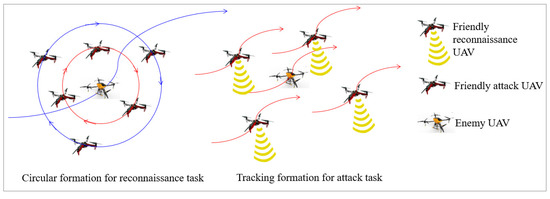 In the cooperative control lower layer, after the task allocation, the UAVs form different groups and cooperatively perform desired formations to accomplish the corresponding tasks. As shown in Figure 1, both the tracking and circular formations are considered according to the requirements of the reconnaissance task 1 and attacking task 2, respectively.