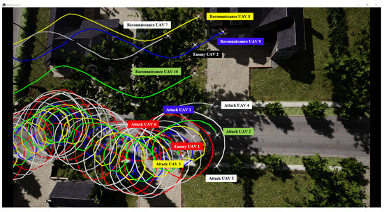 In the cooperative control lower layer, UAVs 1–6 perform a circular formation and UAVs 7–10 perform a tracking formation to accomplish the reconnaissance task 1 and attack task 2, respectively. The desired distance and angular spacing are , , 4, , , 10 and , , 10, respectively. The MIL simulation result of the simplified UAV model through python is shown in Figure 11. As noted in Remark 4, for the circular formation, the UAVs in different orbits can perform different subtasks of the attacking task.